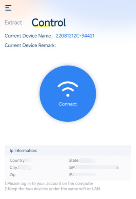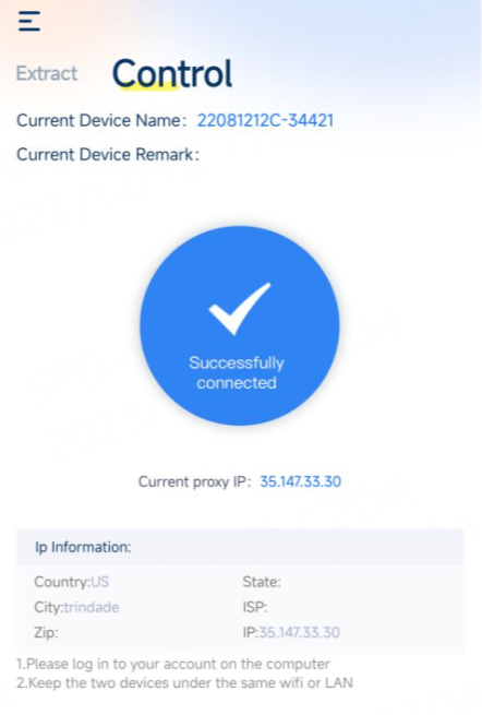 After successful login, the 922 computer application can detect the currently online mobile device. In the Android application, click Control to enter the control interface, and you can control the device in the 922 computer application. (Please note that if you select Extract, you will enter the IP extraction function. This function can extract and manage your proxy on mobile devices. Please click here for a detailed tutorial.)