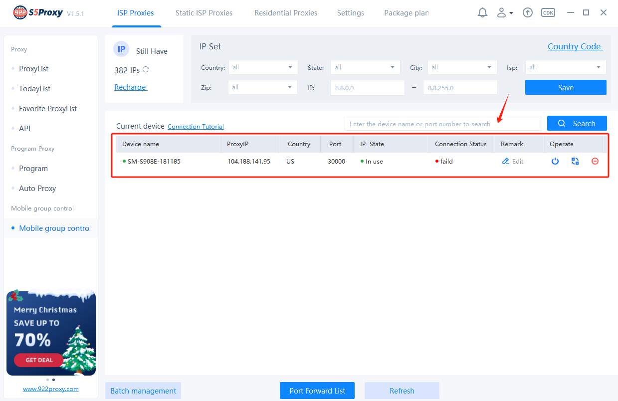 2. The currently online mobile devices will be displayed here. You can view the proxy IP information, IP status, connection status, etc. of each mobile device.