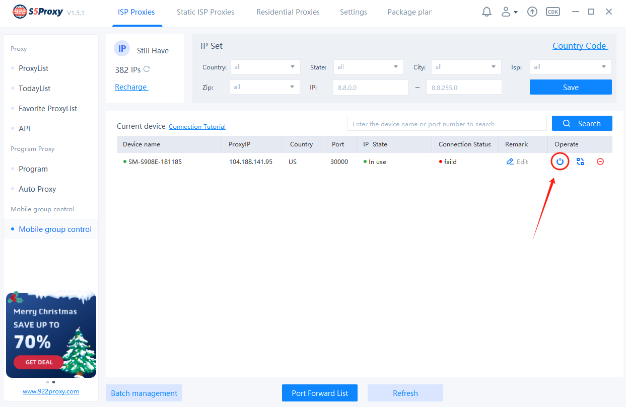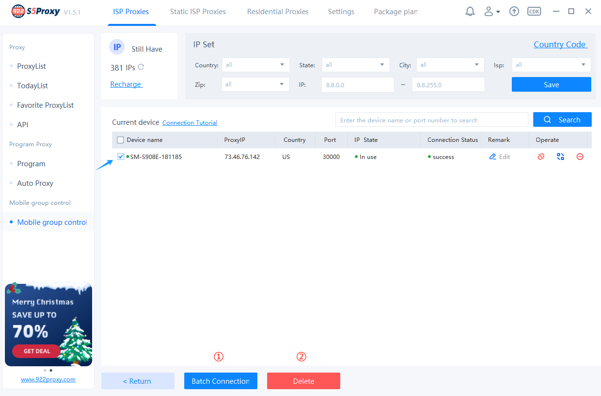There are mobile devices A and B currently online. Device A needs to be connected to the US agent, and device B needs to be connected to the Vietnamese proxy. First, filter the US proxy in the IP Set area and save it, then click the or button on the status bar of device A. Filter the Vietnamese proxy in the IP Set area again and save it, then click the or button on the status bar of device B.