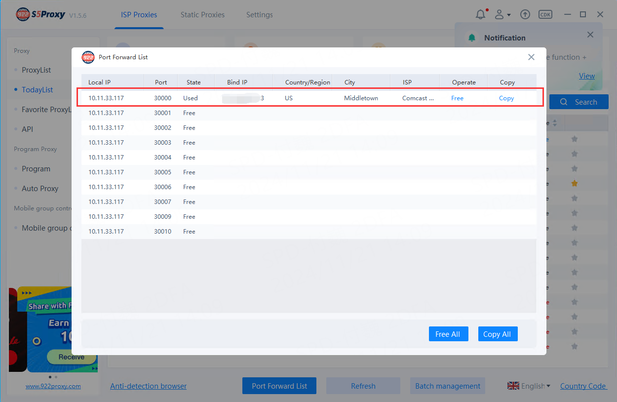 Step 2: Select the “country/region” you need to extract the IP and open the "Port Forwarding List".