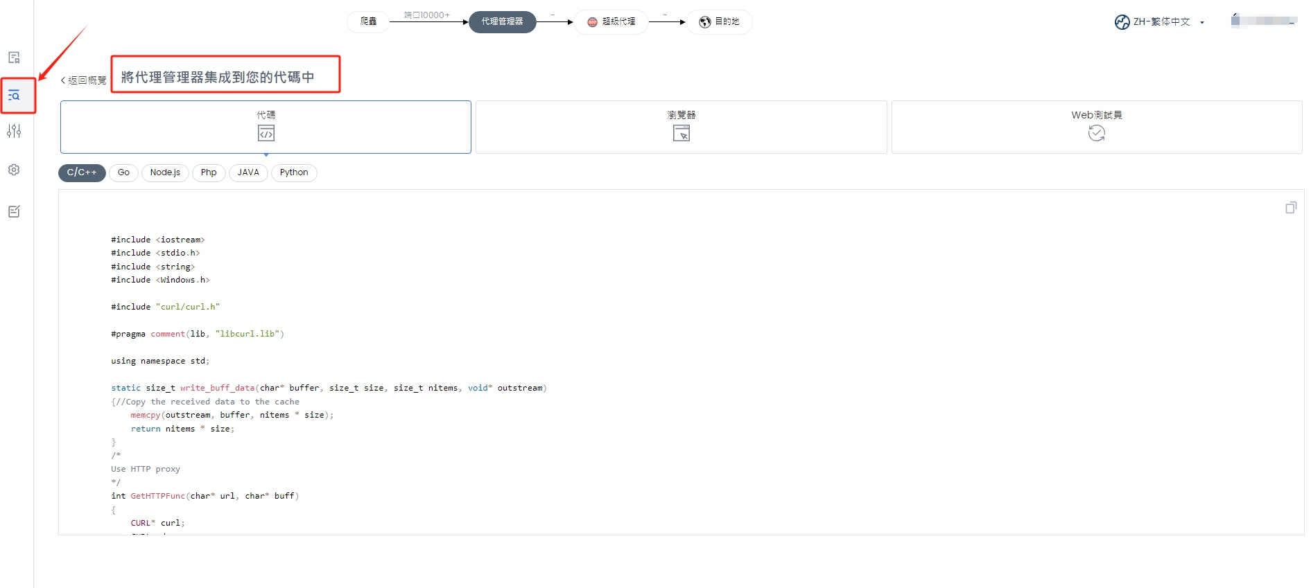 1.選擇「代碼」,為您提供不同語言的代碼使用,如C//C++,Go,js,PHP,Java,Python等。