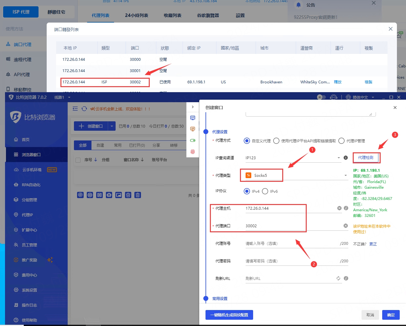 3.將複製的 922proxy "IP 位址" 粘貼到 BitBrowser 的 "代理主機“”代理端口“ 中。