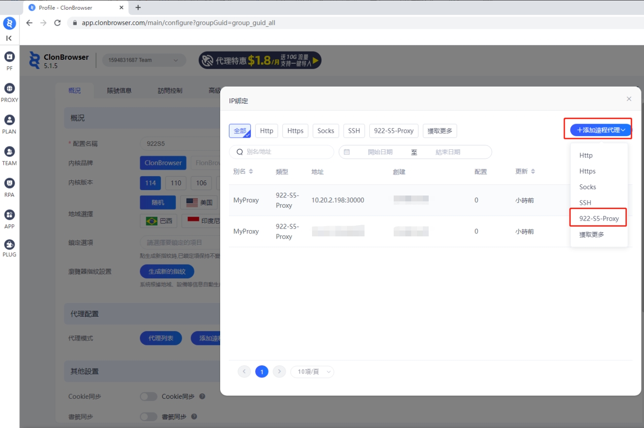 5.點擊“添加遠程代理”,選擇922-S5-Proxy 或者Socks