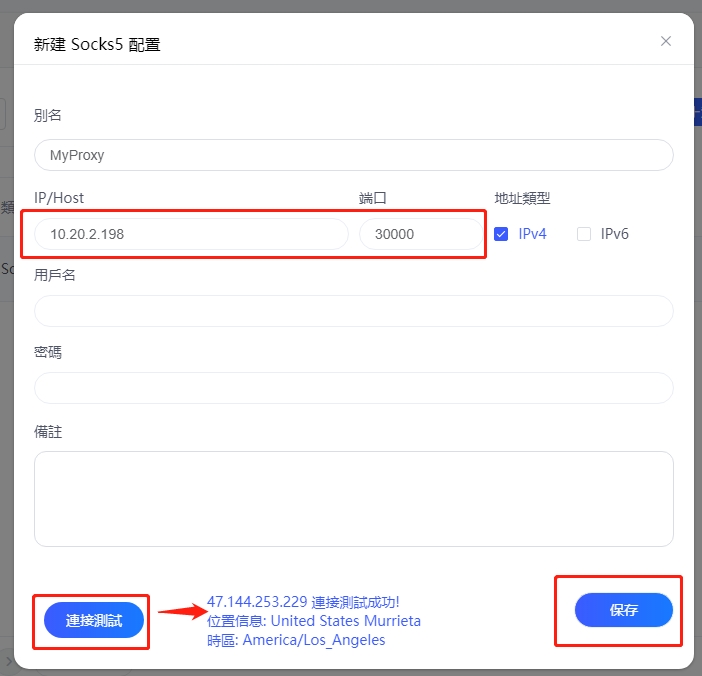 6.把代理IP和端口粘貼進去,點擊連接測試,完成後點擊保存