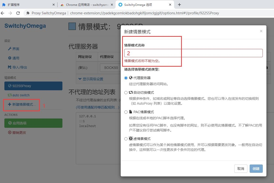 2. 默認已經有代理服務器和自動切換模塊兩個例子,直接修改即可。您也可以點擊新建配置文件創建新的場景模型,輸入名稱並點擊創建。