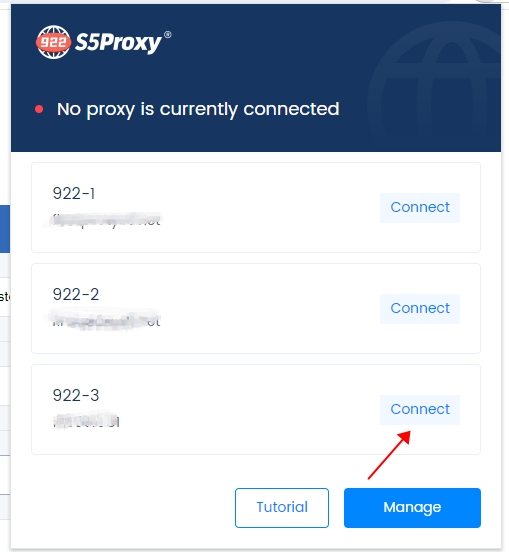 在此處我們可以看到922S5Proxy的擴展代理列表,點擊“Connect”按鈕顯示:”Connected“表示代理啟動成功。此時您打開一個新的瀏覽器窗口就可以使用代理了。
