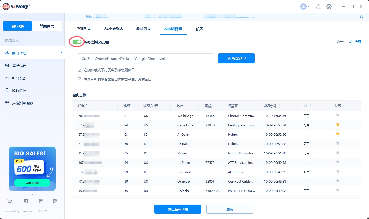 打開922S5Proxy桌面應用程序,進入端口代理界面,點擊谷歌瀏覽器。 點擊開啟谷歌瀏覽器開啟按鈕,在您已安裝谷歌瀏覽器的前提下可以立即開始使用此功能。
