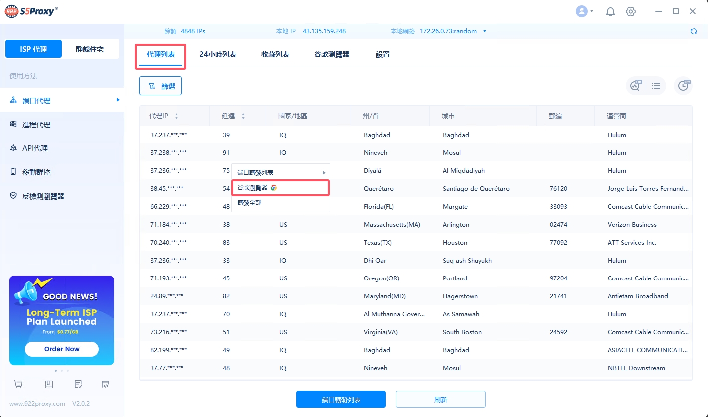 根據您的需要,通過篩選國家、州省、城市等條件,點擊確定獲取目標地區的IP列表。 然後在代理列表點擊鼠標右鍵,在選項中選擇谷歌瀏覽器,提示IP提取成功,即會開啟一個谷歌瀏覽器新視窗。