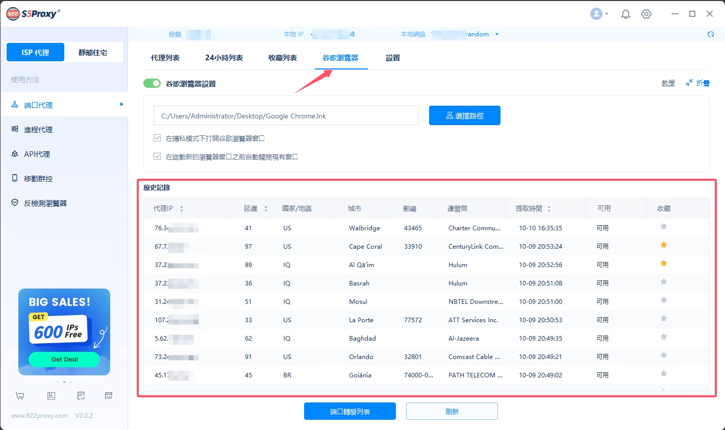 使用谷歌瀏覽器功能選取的IP,均會顯示在谷歌瀏覽器界面的歷史記錄中,IP數據最長可以保存24小時,支持用戶再次使用谷歌瀏覽器功能選取使用和收藏。