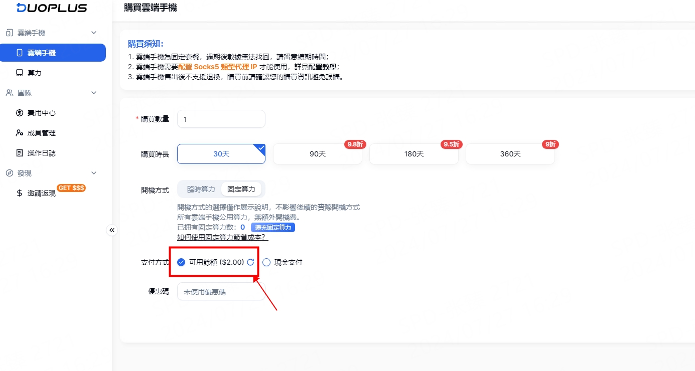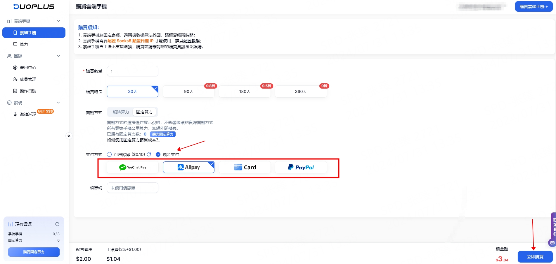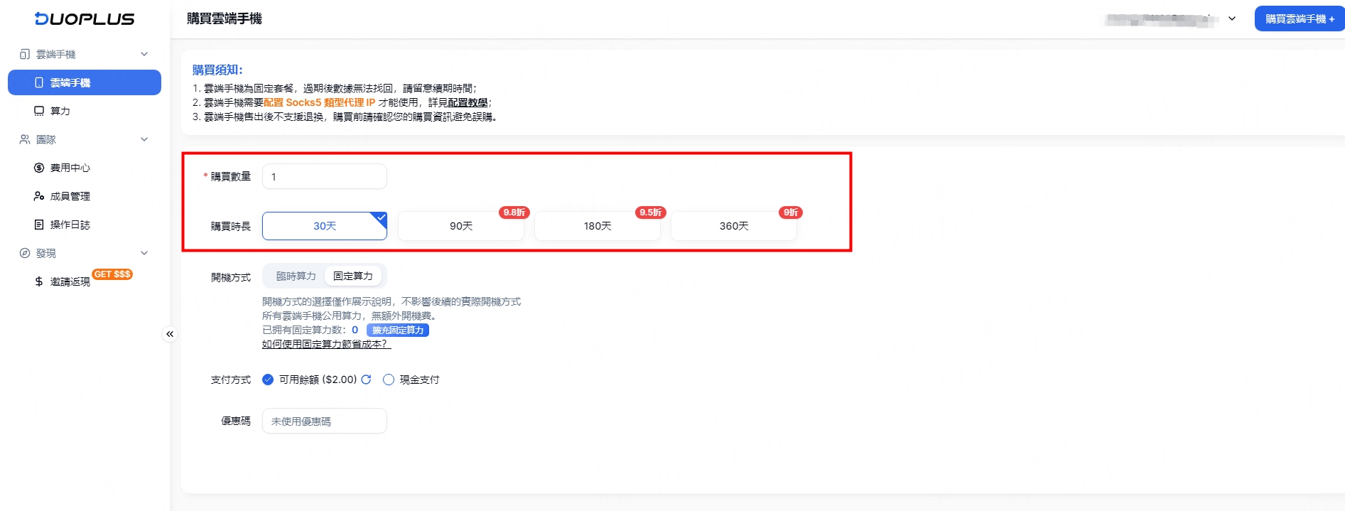●進入購買雲手機介面,根據自身需求選擇好需要購置的雲手機數量和時長。