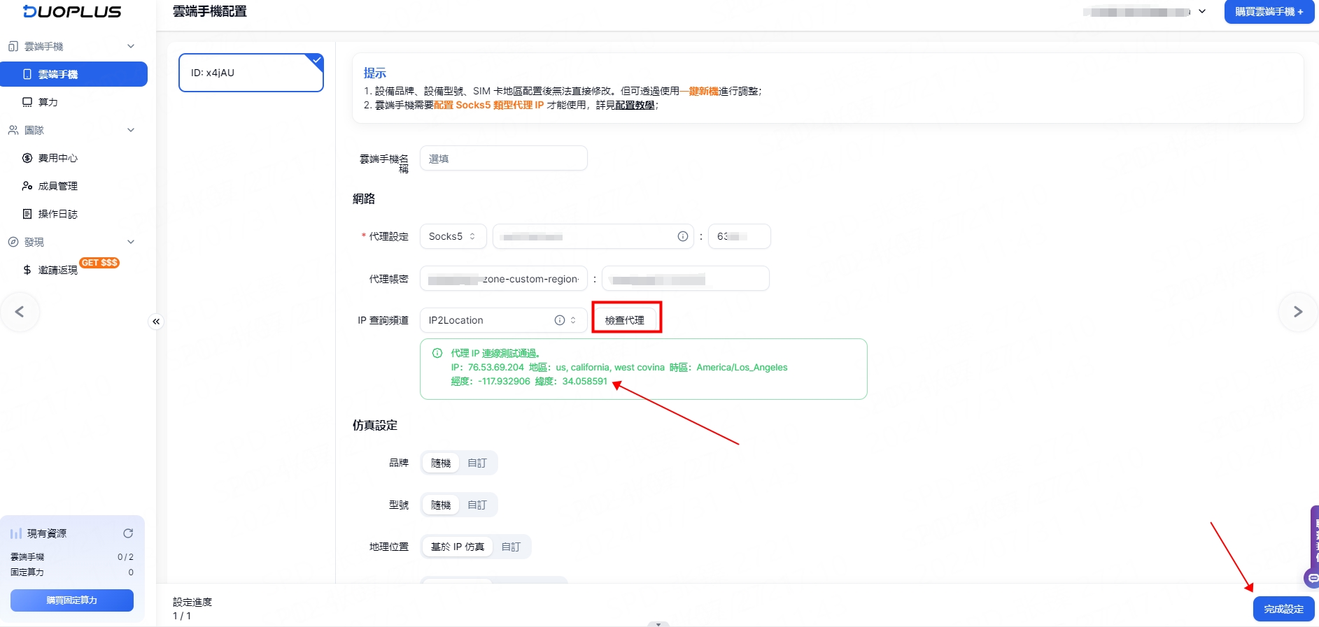 2)代理檢測成功後,點擊完成配寘,即完成創建一臺雲手機。