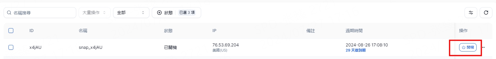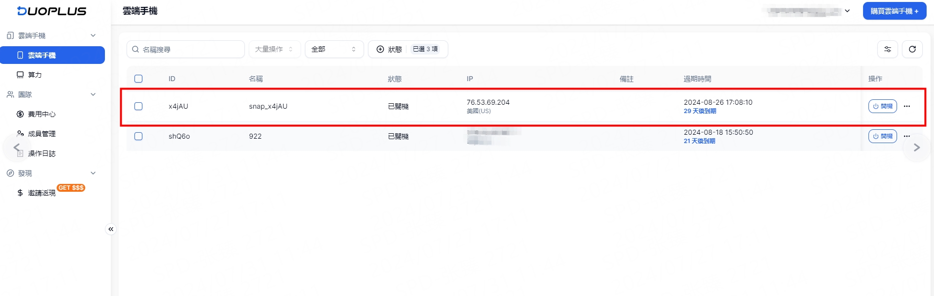 1)創建好雲手機之後,即可正常開啟雲手機使用,用戶可按照需求選擇計費模式,按時計費(餘額充足)或者購買固定算力(隨時開機),點擊【開機】。