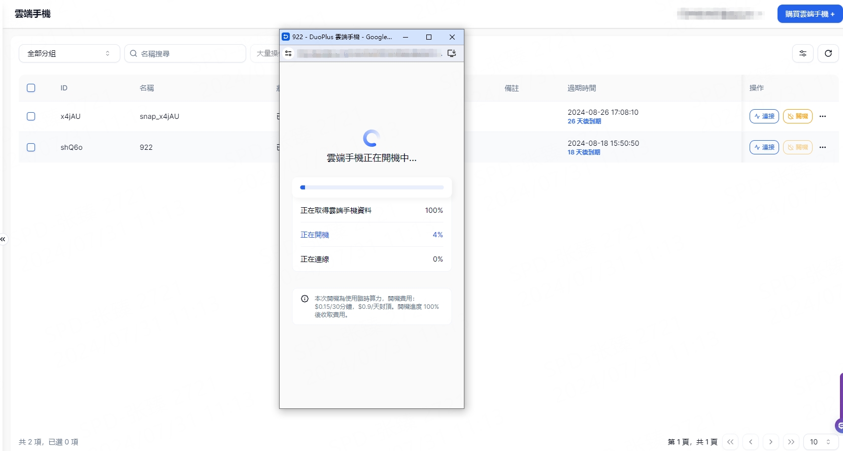 2)點擊【連接】,等待幾秒鐘即可完成開機,這樣就生成一臺全新的雲手機,雲手機支持多種功能:画质調整、批量上傳文件、一鍵新機、參數修改等。 立即体驗!