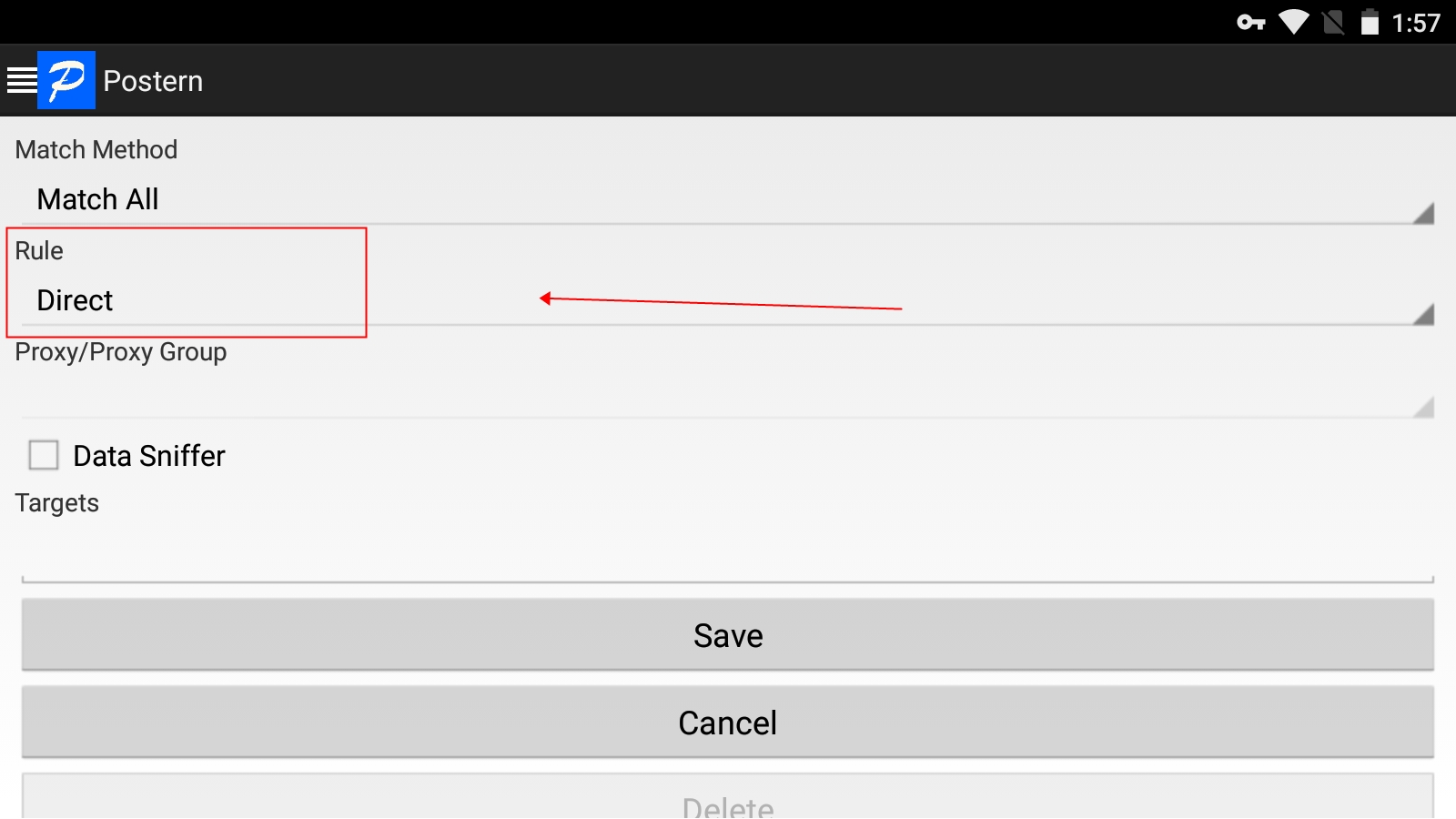 3. 在規則設置中,選擇匹配方式為 Match All,規則類型選擇 Proxy/Tunnel,Proxy/Proxy group 選擇之前設置的代理配置。
