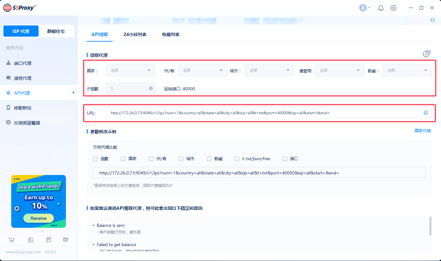 需要注意的是,API僅適用於從“代理列表”中獲取IP,不適用於“24小時列表”中的代理,一旦您成功獲取代理後將扣除相應金額。