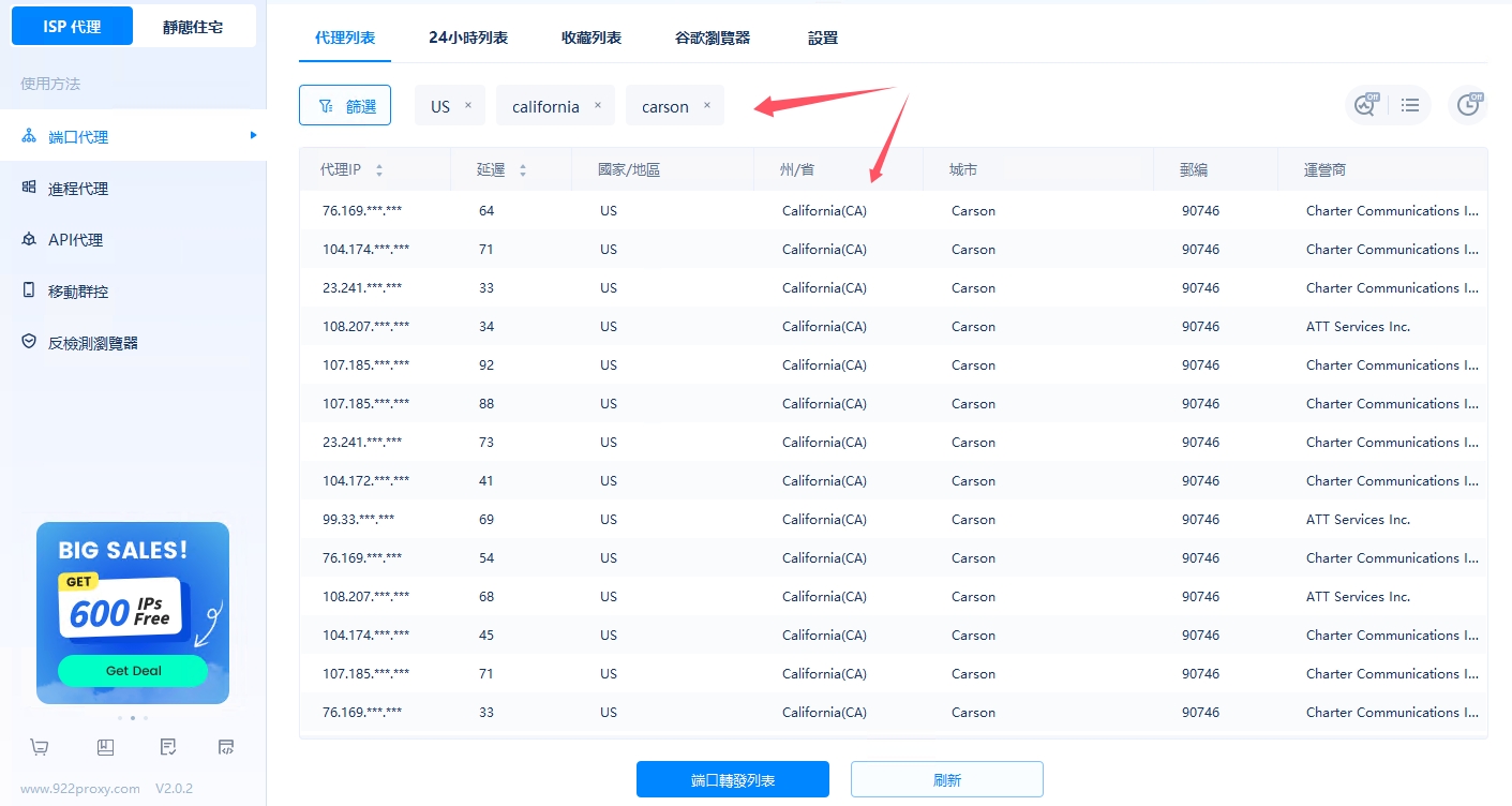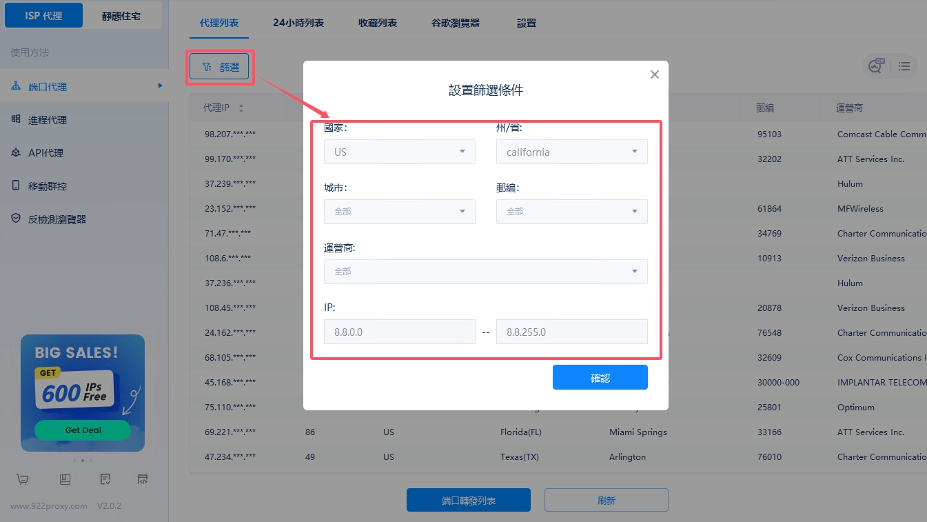 根據您的需要篩選國家/州/城市等,點擊“确认”即可獲得目標地區的IP列表; 或者直接选择目標地区的運營商/郵編/IP段進行更加精確的定位;