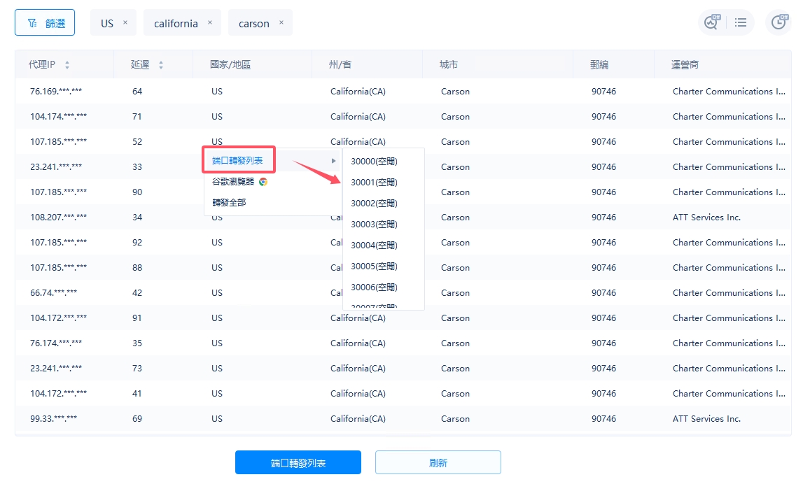 從获取的IP列表中選擇一個代理,點擊右鍵,在下拉列表中選擇需要轉發的端口,即提取成功。