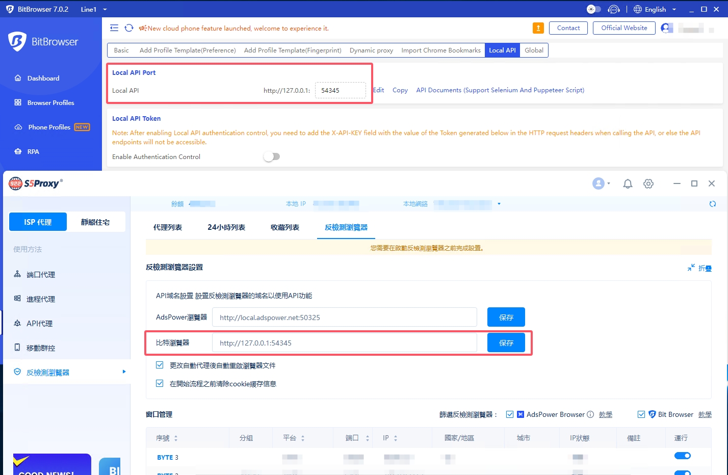 2.如果不一致,複製比特瀏覽器的API端口粘貼到922 S5 Proxy客戶端→反檢測瀏覽器→比特瀏覽器,然後點擊[Save]。