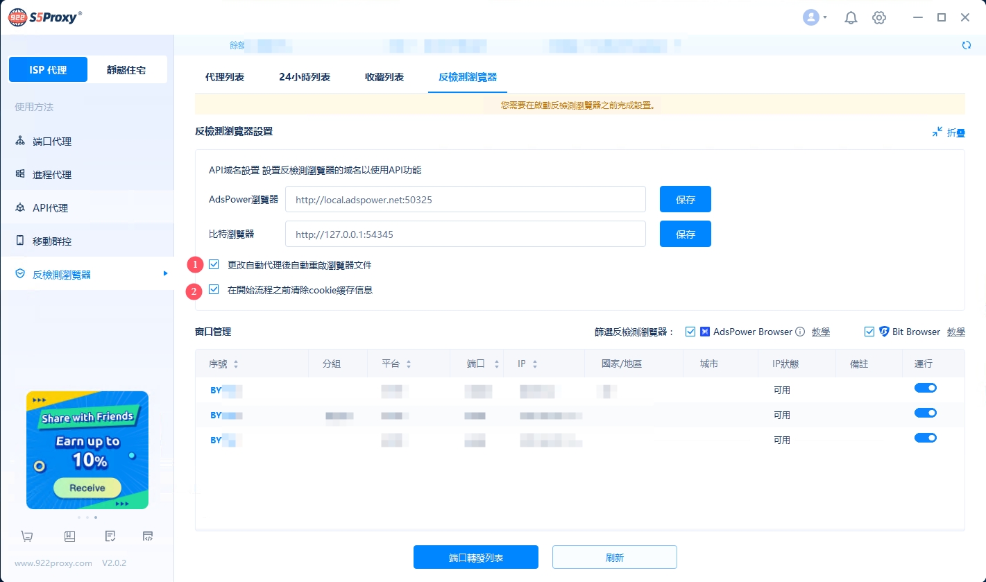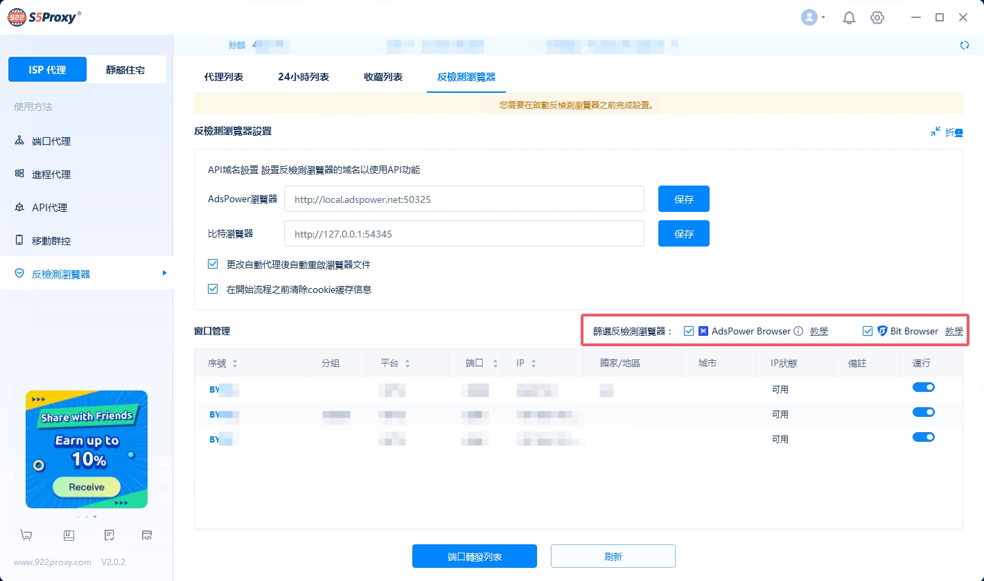 1.勾選Bit Browser表示開啟比特瀏覽器反檢測代理功能