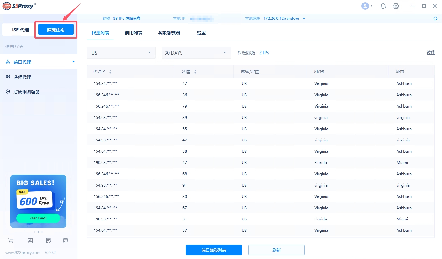 然后,打開922S5客戶端,選擇"靜態住宅代理”。 首先,我們來了解一下界面上的元素分別是什麼: