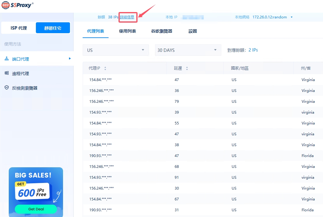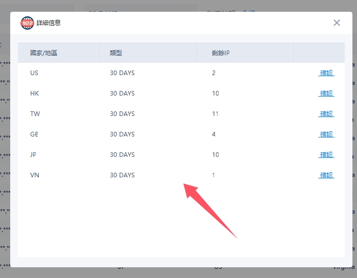 點擊“詳細信息”,在這裡,您可以看到IP類型和剩餘的IP數量。 您可以選擇不同國家和不同時長類型的靜態IP进行使用。 如果未選中,則默認優先使用短時間IP。