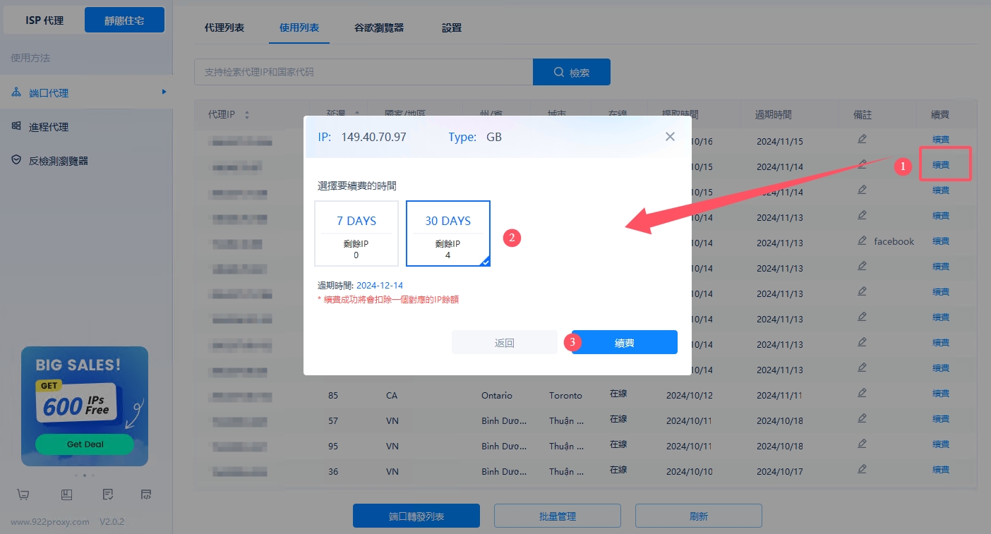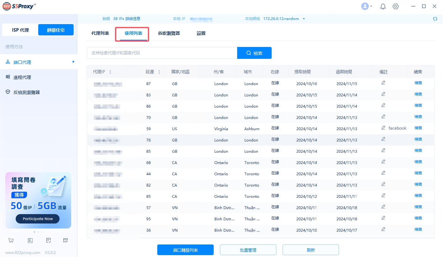點擊“使用列表”,您可以在這裡查看IP提取時間、過期時間和狀態。 您可以在IP的有效期內重複使用,次數不限。
