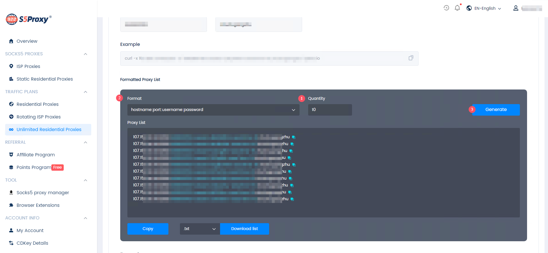 3. Click Generate: You can copy the generated proxy command to put down in the anti-detection browser or other applications and tools, then you can start to use the proxy.