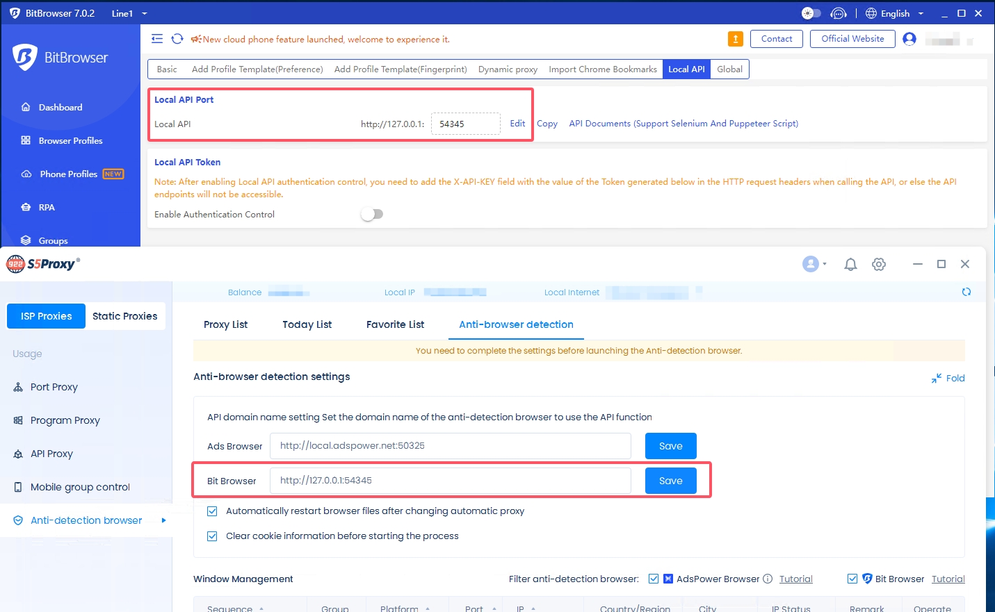 2. If they are inconsistent, copy the API port of Bit Browser and paste it into 922 S5 Proxy Client → Anti-Detection Browser → Anti-browser detection→Bit Browser, and then click [Save].