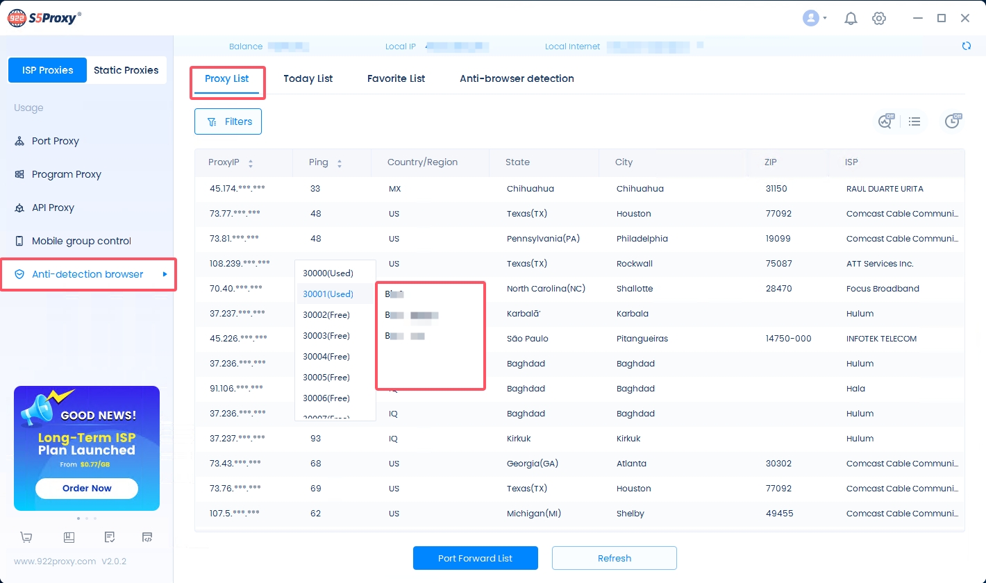 Enter the proxy list interface, select an IP, right-click and select Forward to Port, and the currently enabled anti-detection browser file will appear. Finally, click on the anti-detection browser file you want to use to start using it.