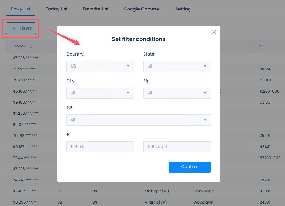 Filter the country/state/city, etc. according to your needs, and click "Confirm" to obtain the IP list of the target area; or directly select the ISP/zip/IP segment of the target area for more precise targeting;