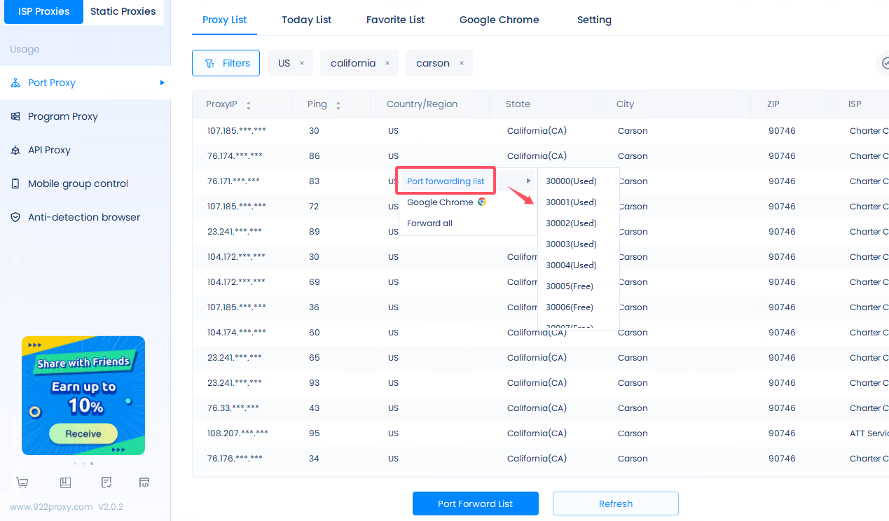 Select a proxy from the obtained IP list, right-click, and select the port to be forwarded in the drop-down list, then the extraction is successful.