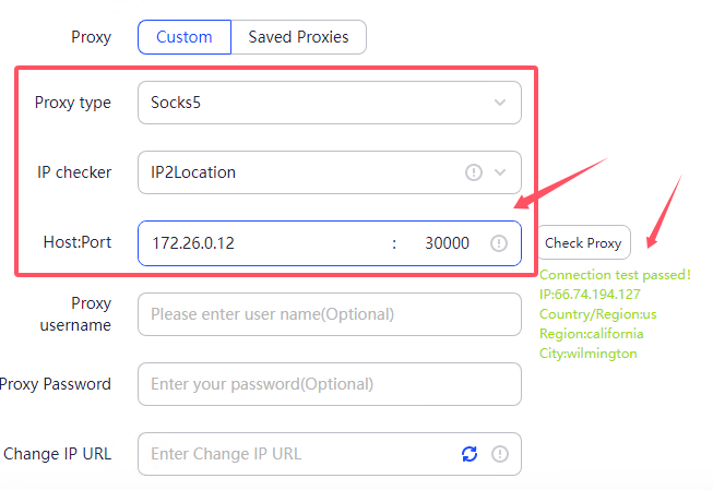 Finally, configure the copied IP and port number into a browser or other software for use. (The picture below takes the Anti detection browser as an example)