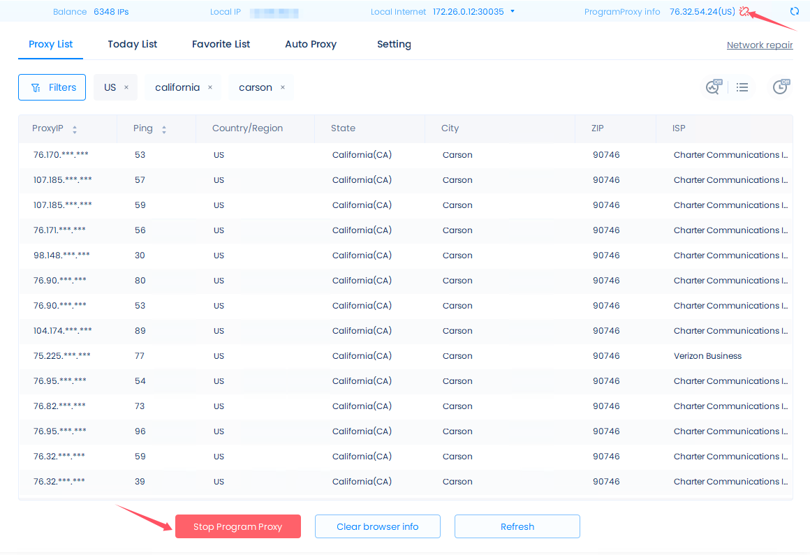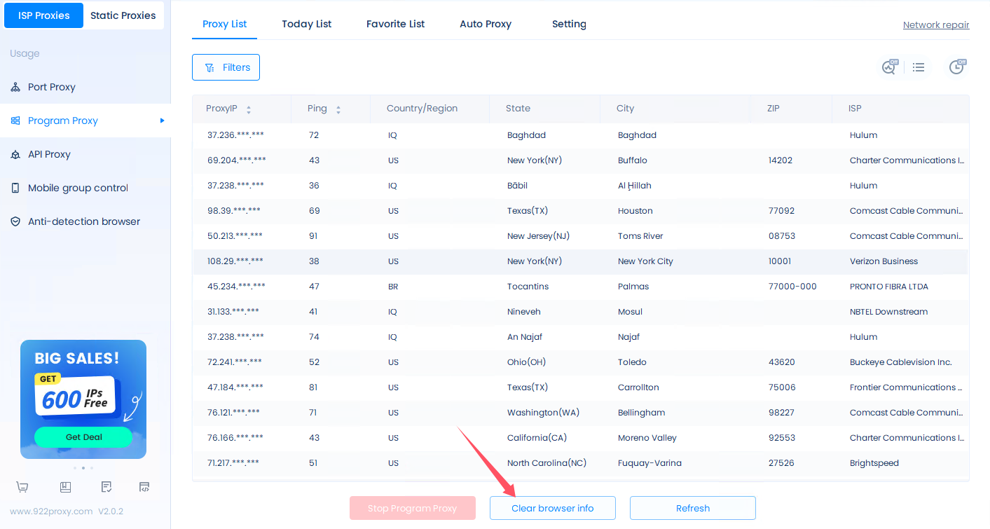 Please pay attention! ! ! When you connect the proxy to the browser, the browser cache may cause the proxy connection to fail, so it is recommended to click the "Clear Browser Info" button to close the browser to clear the previous IP cache, and then start the program proxy.