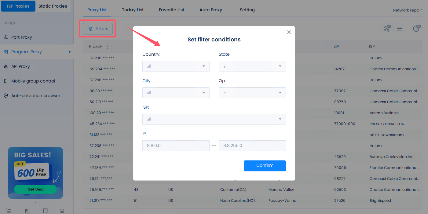 Filter the country/state/city, etc. according to your needs, and click "Confirm" to get the IP list of the target area; or directly select the ISP/zip/IP segment of the target area for more precise positioning;