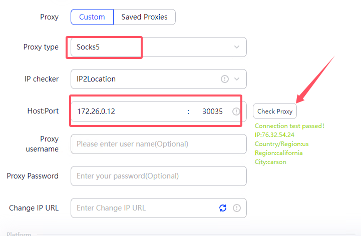 -Open the anti-detection browser, select SOCKS5 as the proxy type, and fill in the IP and port you just copied here. Finally, click Check Proxy. If it prompts "Connection successful", it means that the proxy is valid.