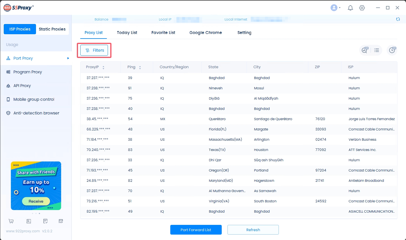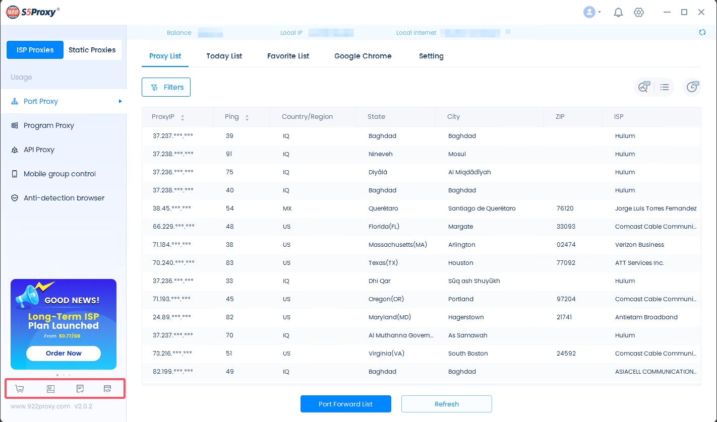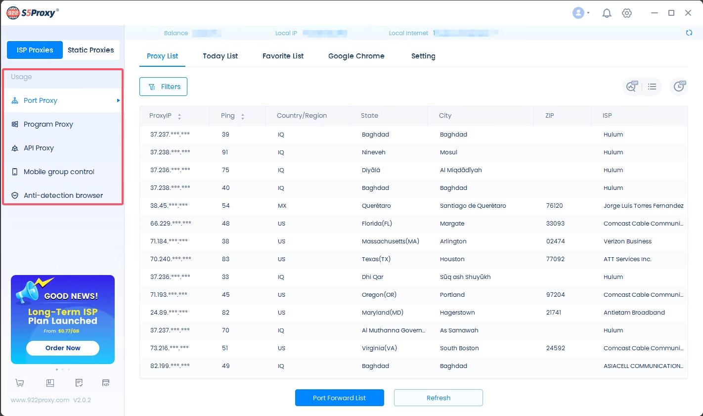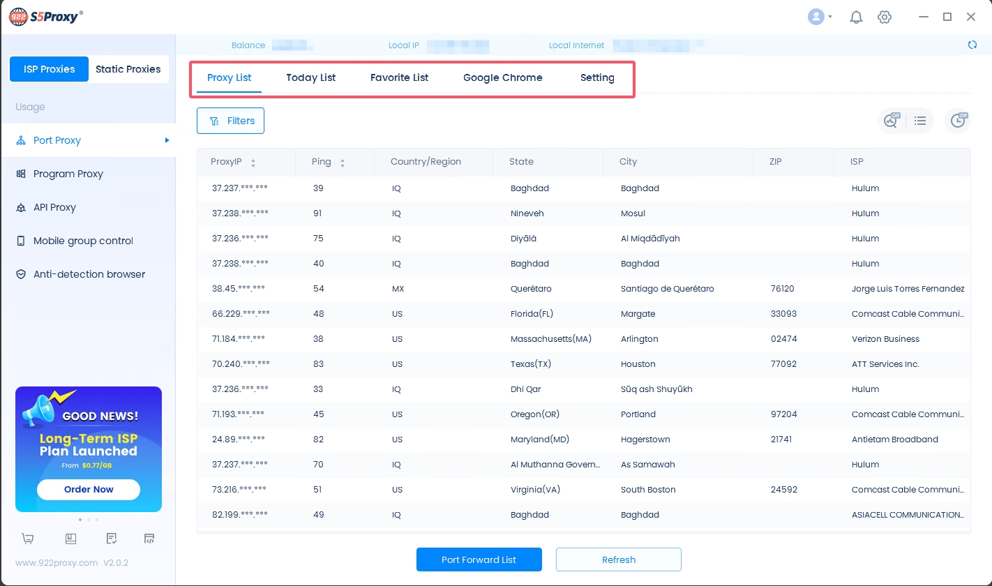 Proxy List: This interface displays all IP proxy resources of 922S5. You can perform IP filtering, port forwarding to extract IPs, and batch port forwarding to extract IPs.