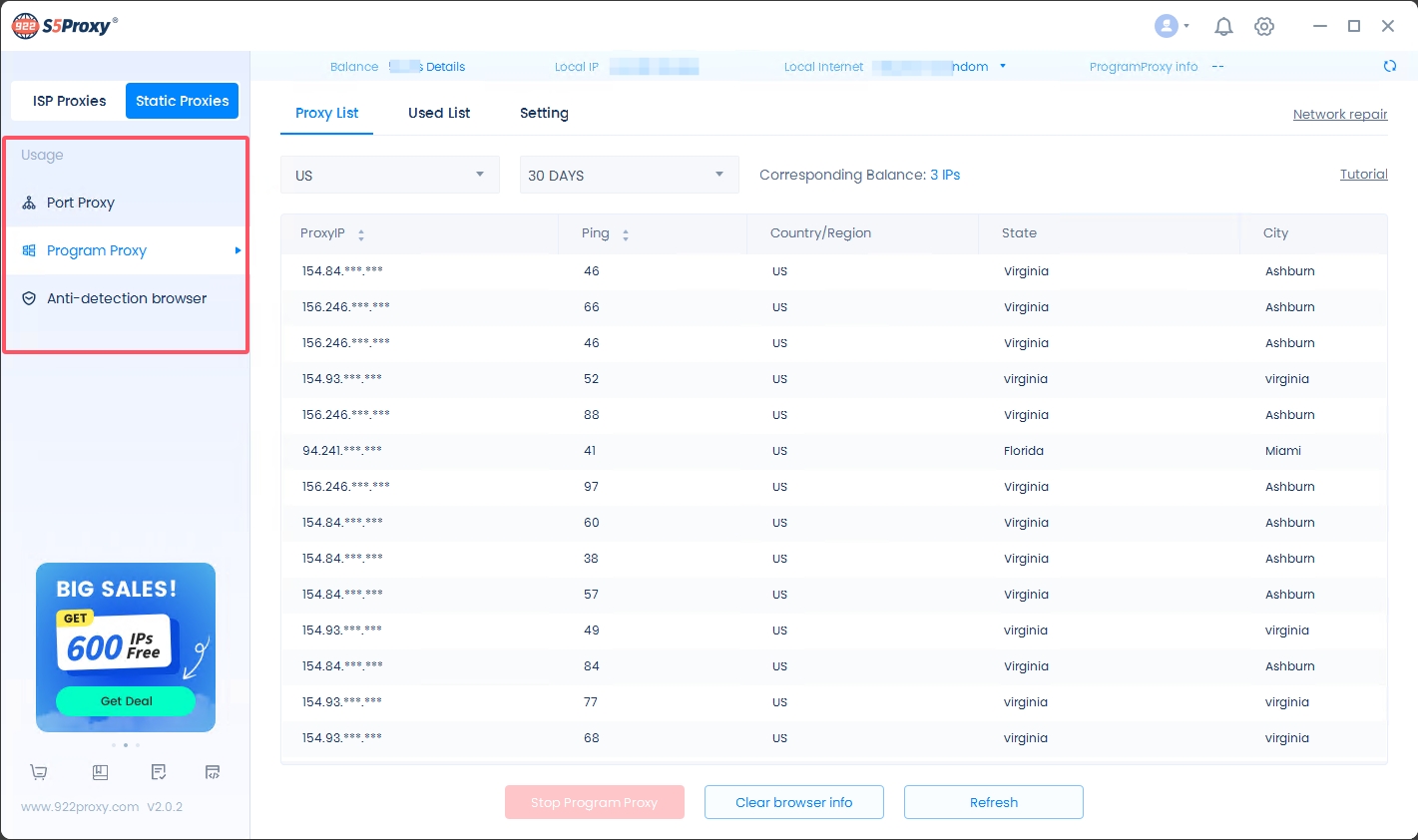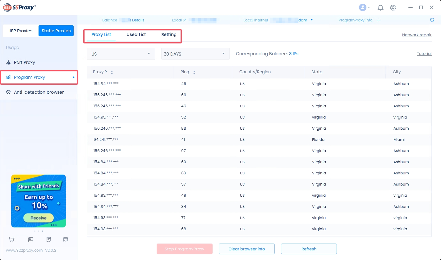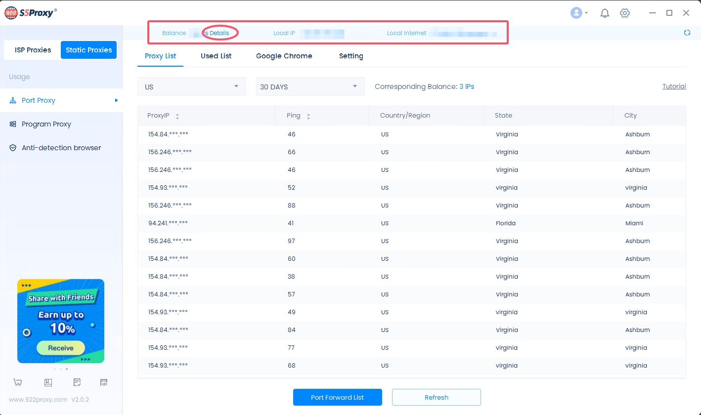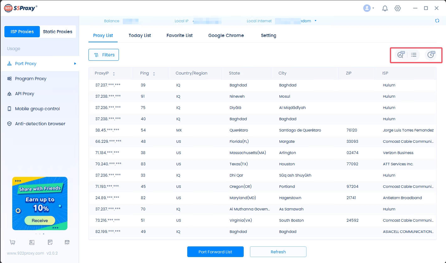 Proxy List: This interface displays all IP proxy resources of 922S5. You can perform IP filtering, port forwarding to extract IPs, and batch port forwarding to extract IPs.