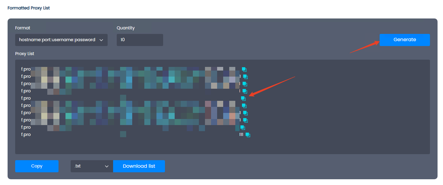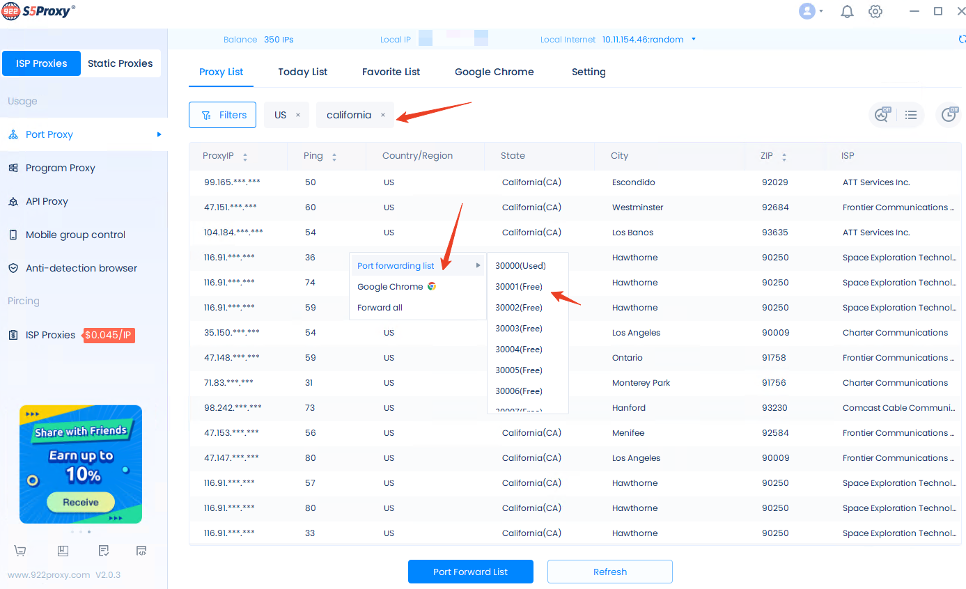 1. Set the filter conditions, select the country/state/city/zip code, etc., click "Confirm" to obtain the proxy list of the target area, and then right-click to select the proxy IP and port;