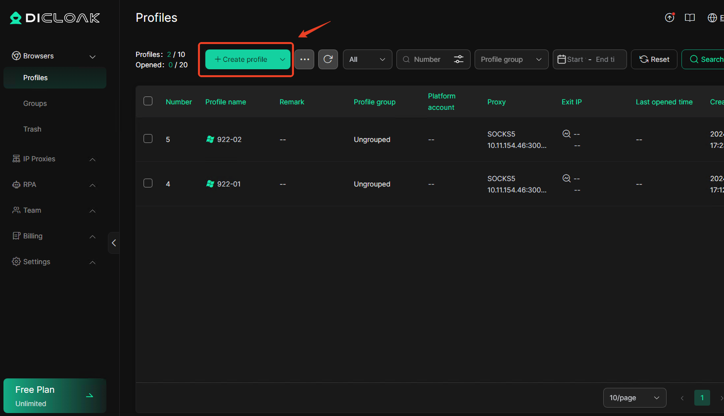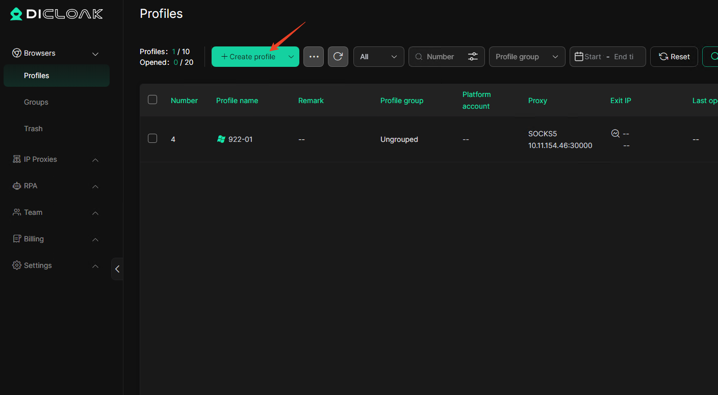 1. Open the DICloak anti-fingerprint browser and click the "Create profile" button on the "profiles" page