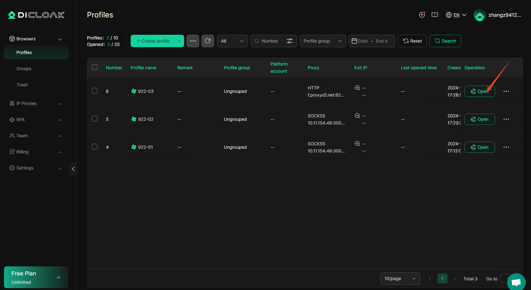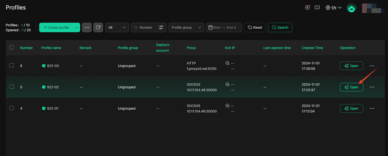 3. Click the "Open" button. If the IP address displayed on the browser page is consistent with the IP address extracted on the 922 client, it means the browser environment is created successfully.