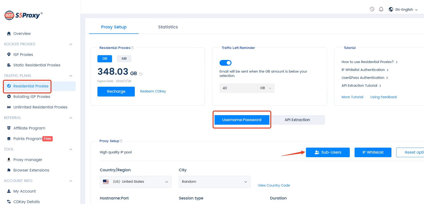 Here, residential proxy (traffic) is used as an example to demonstrate the steps.
