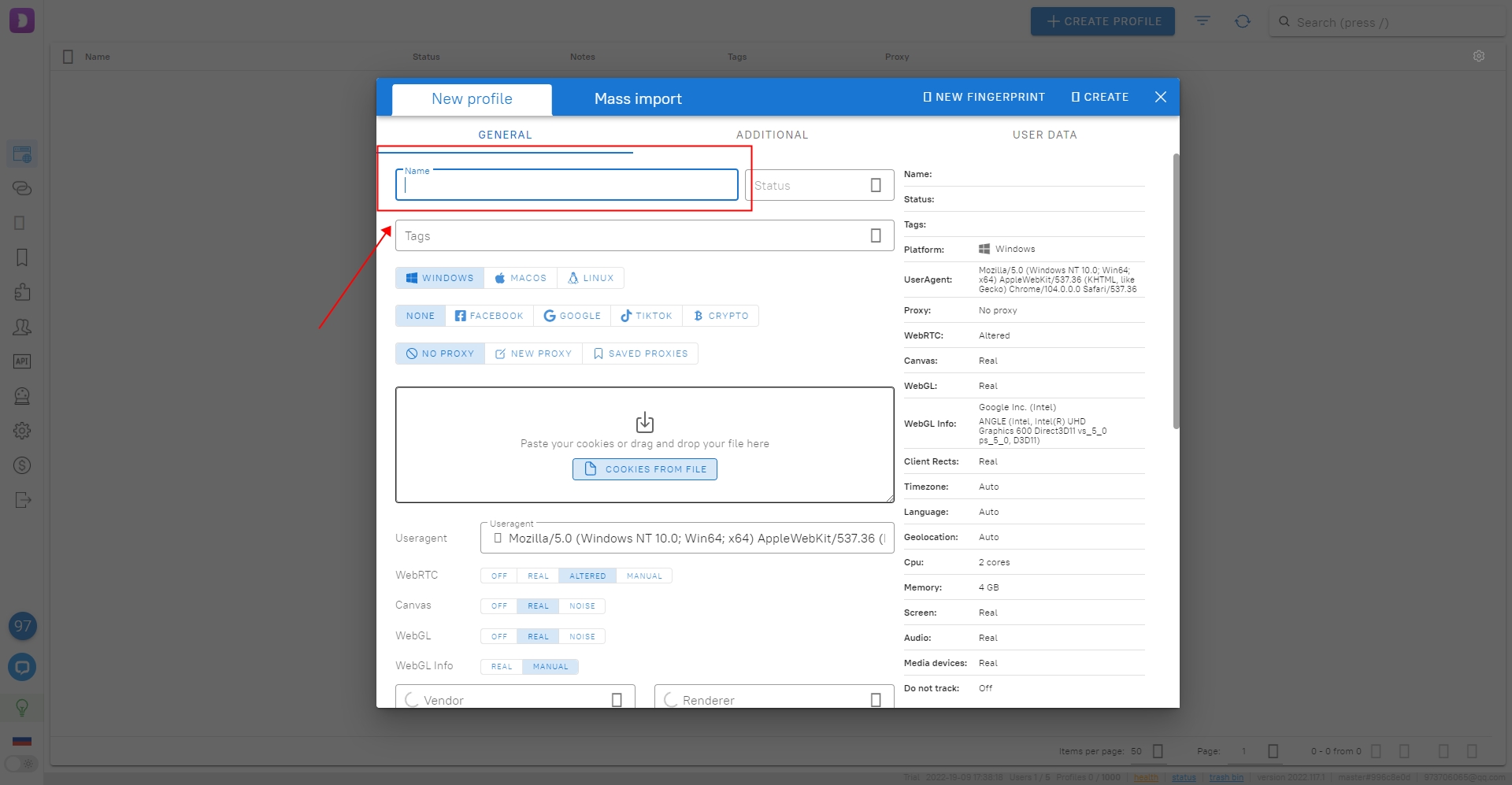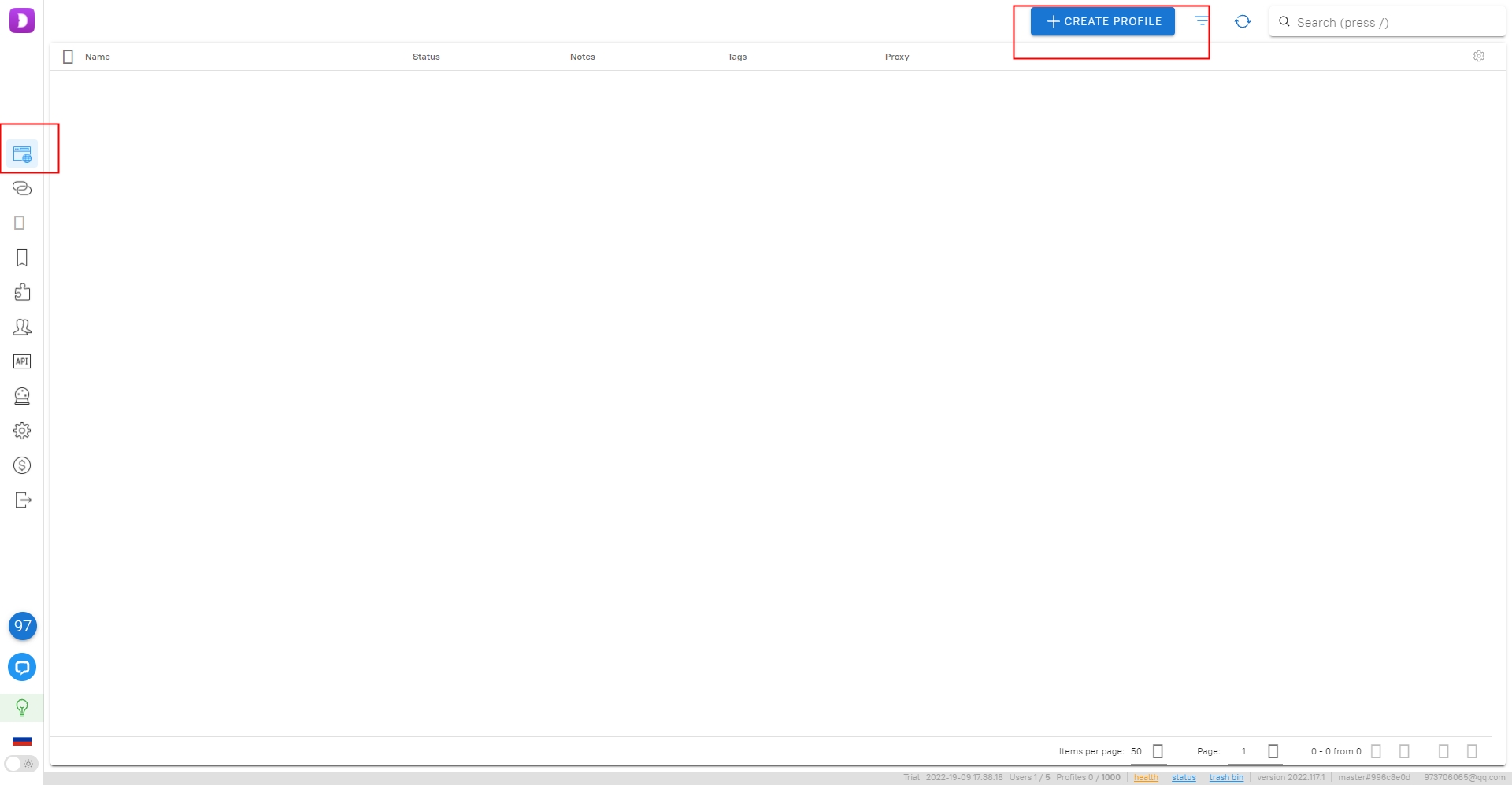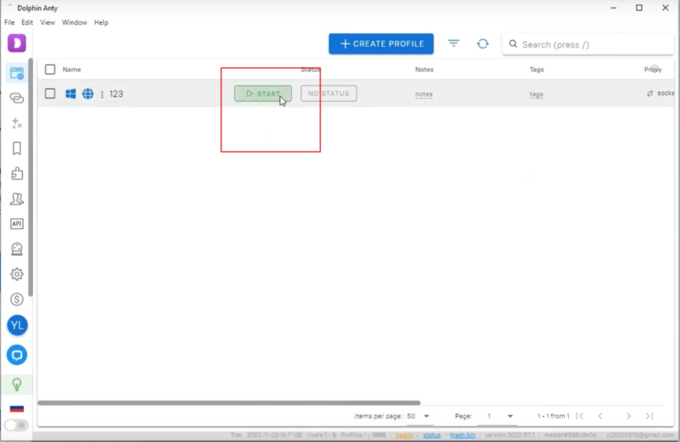 1. Open Dolphin Anty and Click CREATE PROFILE