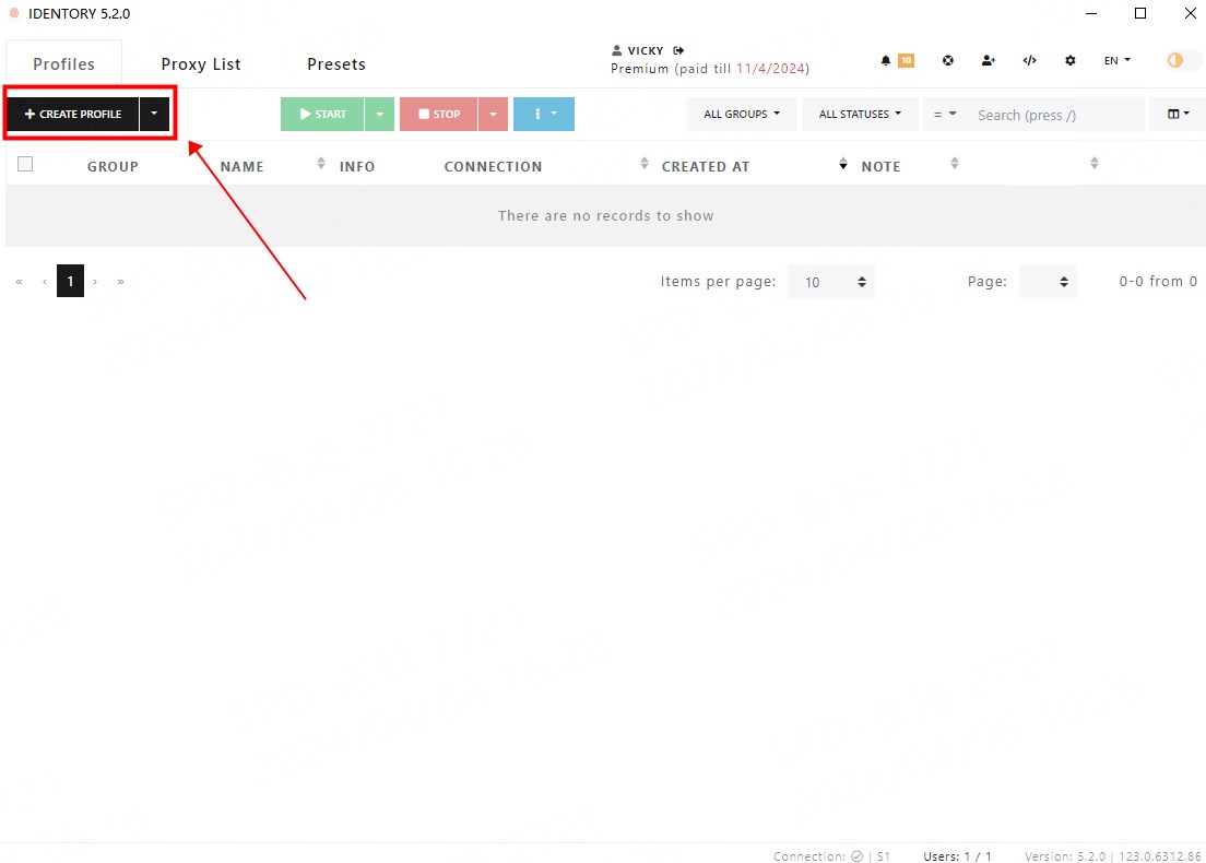 3.Open IDENTORY and click on the CREATE PROFILE button on the Profiles page