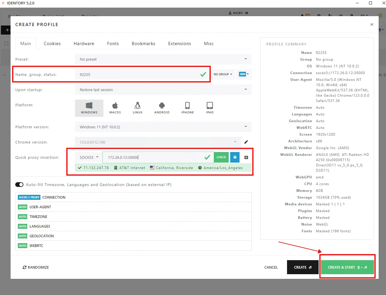 4.Enter the name, select Socks5 for the proxy agreement, paste the copied proxy IP into it, and finally click CREATE&START to start