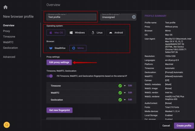 Write your profile's name, choose OS and browser. Click Edit proxy settings.