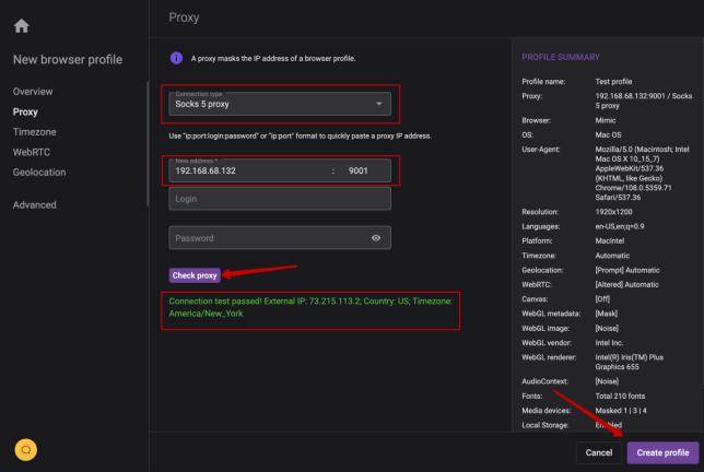 Find proxy type and select Socks5. Then fill in the IP address. Paste the Local IP and port values and check proxy. Click Create profile after that.