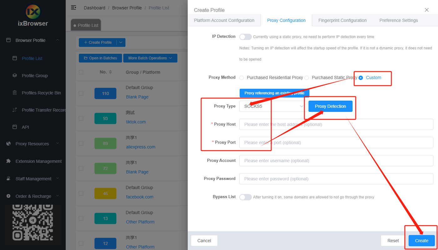 3.On the proxy configuration page, select the proxy mode as "Custom", select the proxy type as "HTTP" or "SOCKS5", enter the IP information obtained in step 1, click Proxy Detection, when the detection passes, click below to modify it immediately and it will be normal. use.