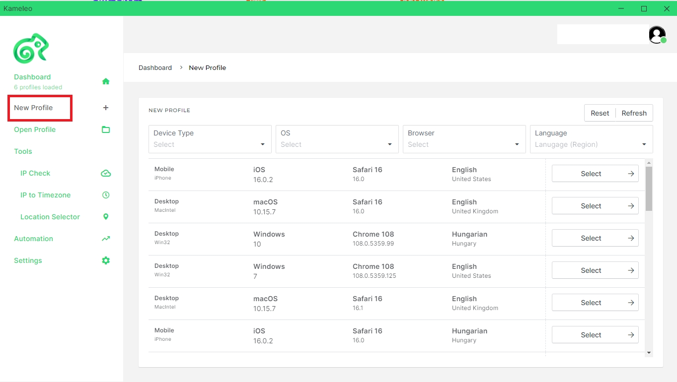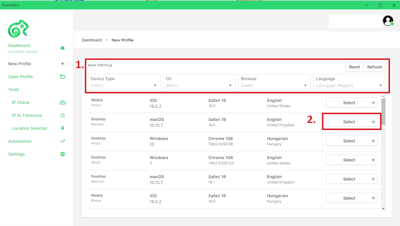 Use the filters to browse between desktop or mobile profiles or filter OS, browser or language. When you found one you like, click on select.