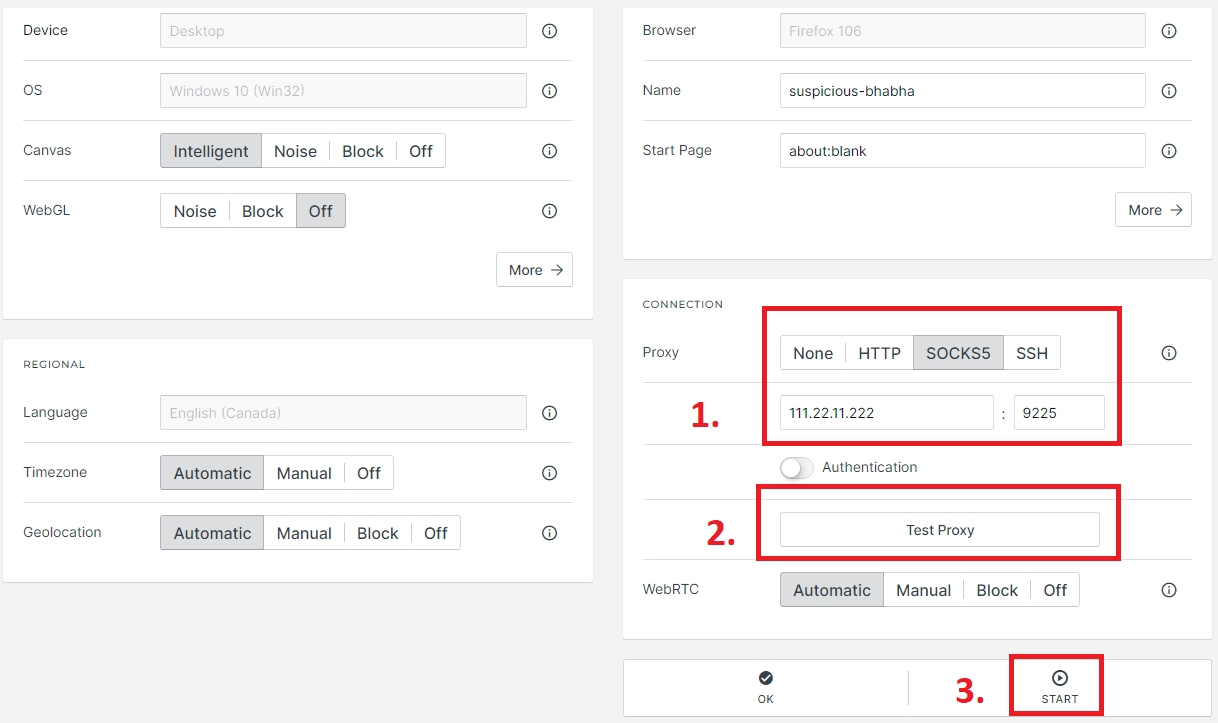 Leave most of the settings on automatic for the best experience. Add your proxy info, test it and start the profile.