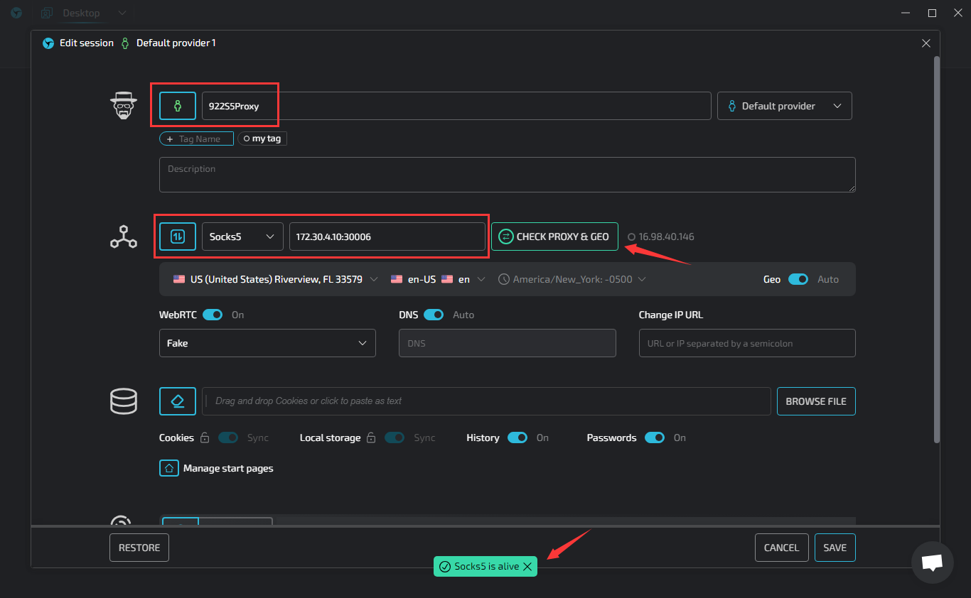 Open LinkenSphere client and click Create [NEW SESSION]. Select [Socks5] as the proxy type, then copy the IP and port of the proxy configured in Step 1, and click [CHECK PROXY] to check the proxy, as shown in the figure, successful proxy detection means that the proxy can be used normally. Finally, click [SAVE] to save.